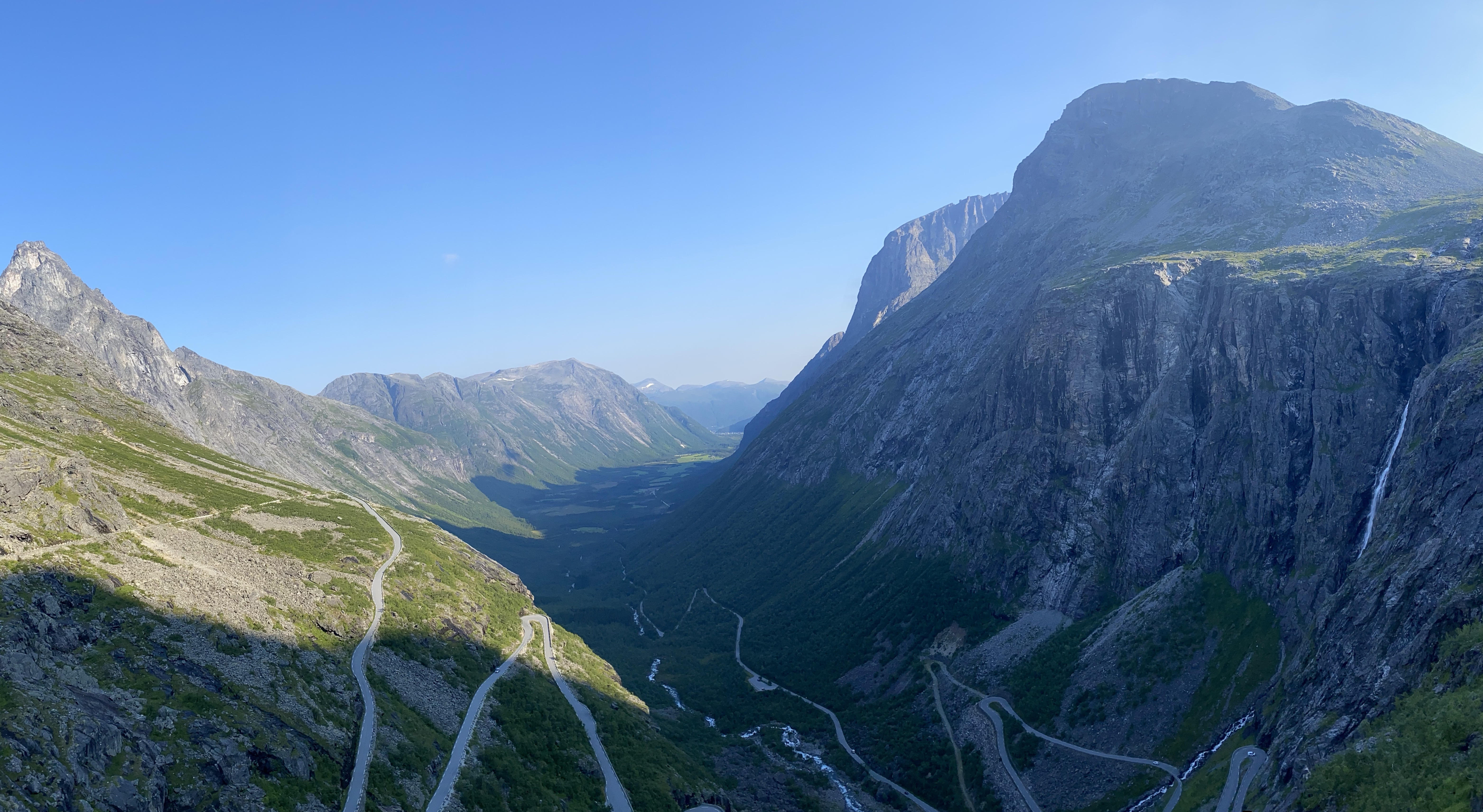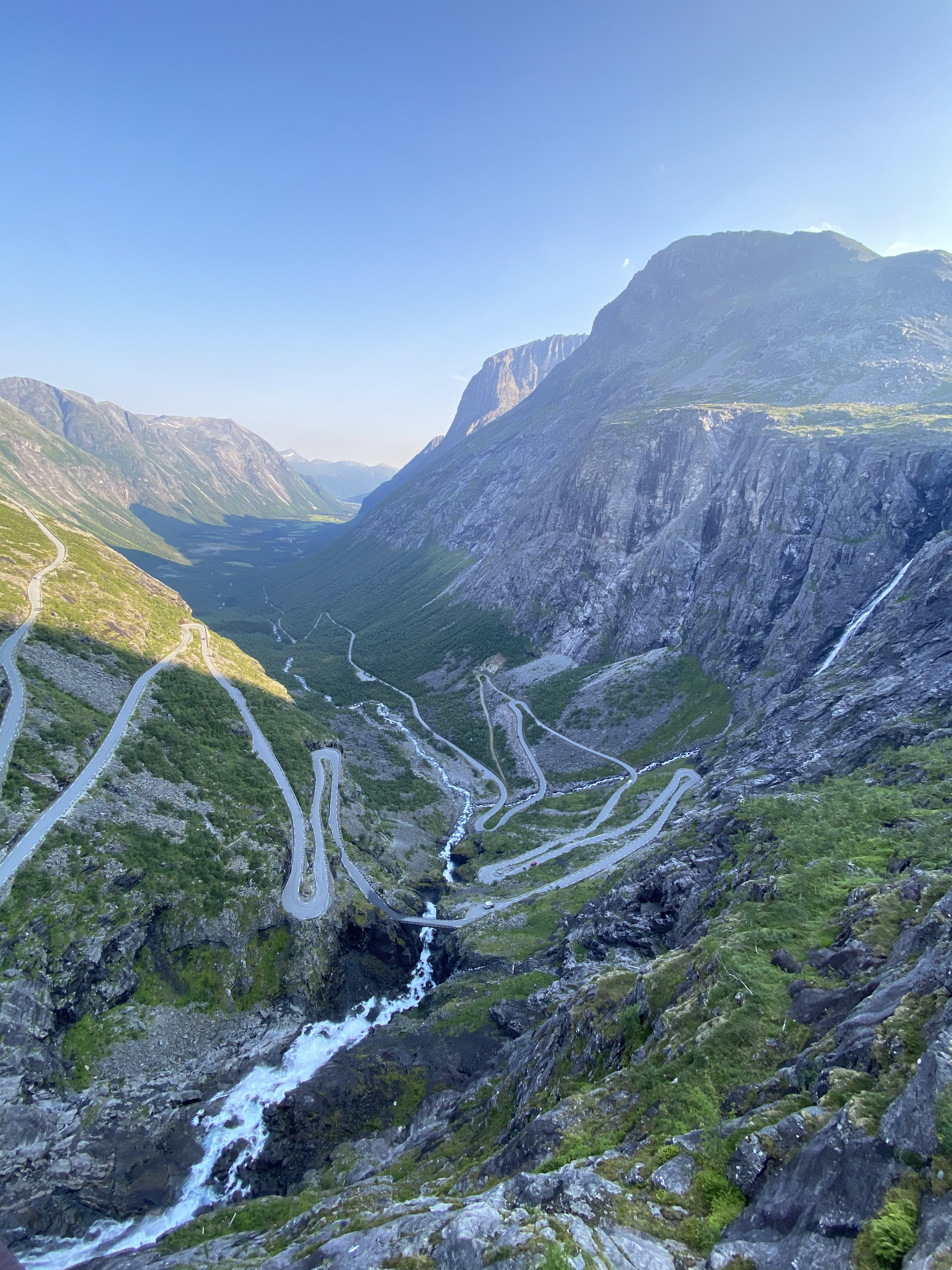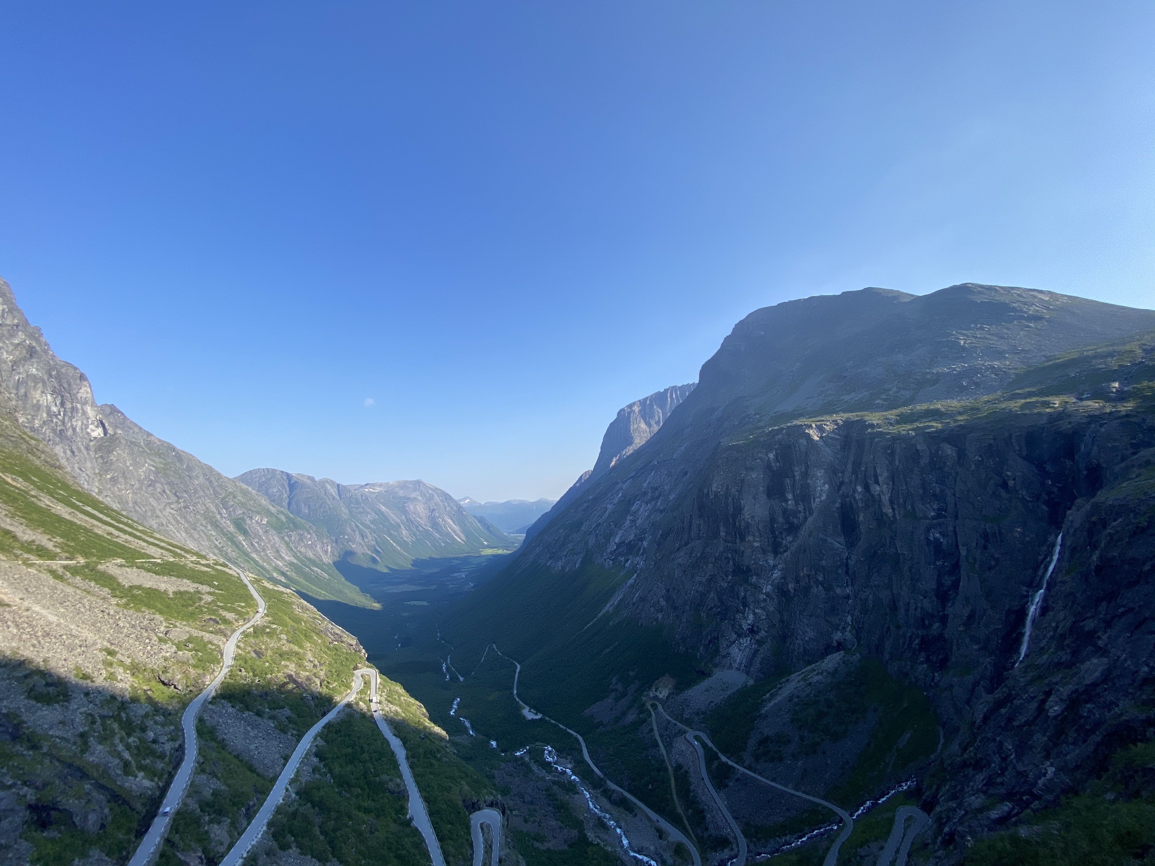 Nachdem wir heute morgen nach dem Aufwachen das Rauschen des Flusses und die Glocken einiger Schafe hörten, starteten wir mit unserem morgendlichen Ablauf zum Start in den Tag und machten uns dann auch schon auf den Weg. Bis zum Anfang der Trollstigen waren es nur 10 Minuten Fahrt. Zunächst nutzten wir noch den Ausblick von oben, um dann die kurvenreiche steile Strecke hinunter zu fahren. Vorher hatten wir darüber einiges gelesen, für einen sicheren und souveränen Fahrer ist es aber offensichtlich gut machbar. Unten angekommen gab es auch wieder einen kurzen Drohnenflug.