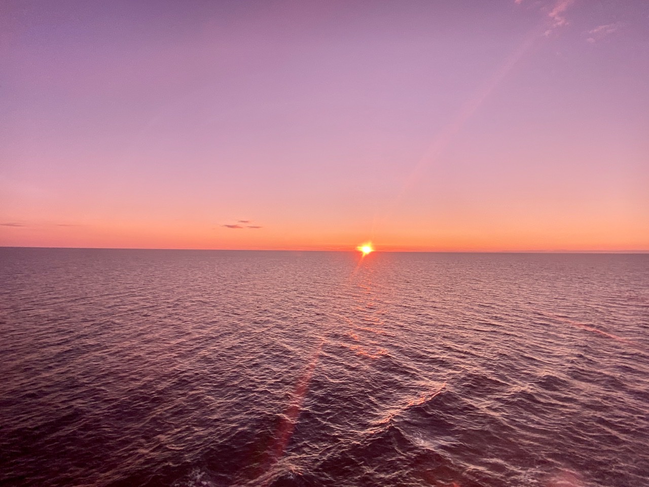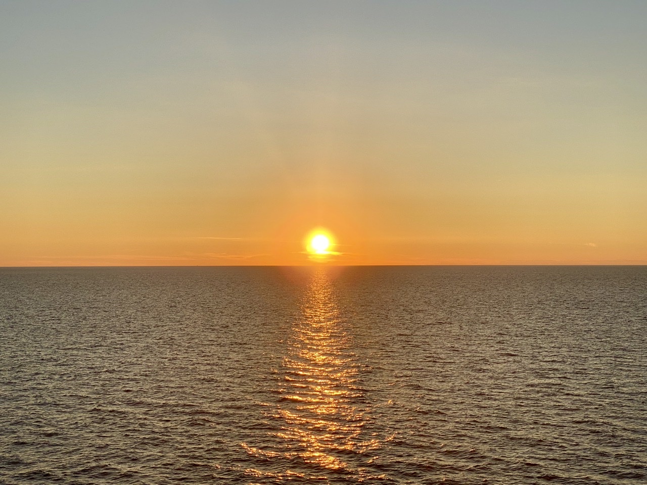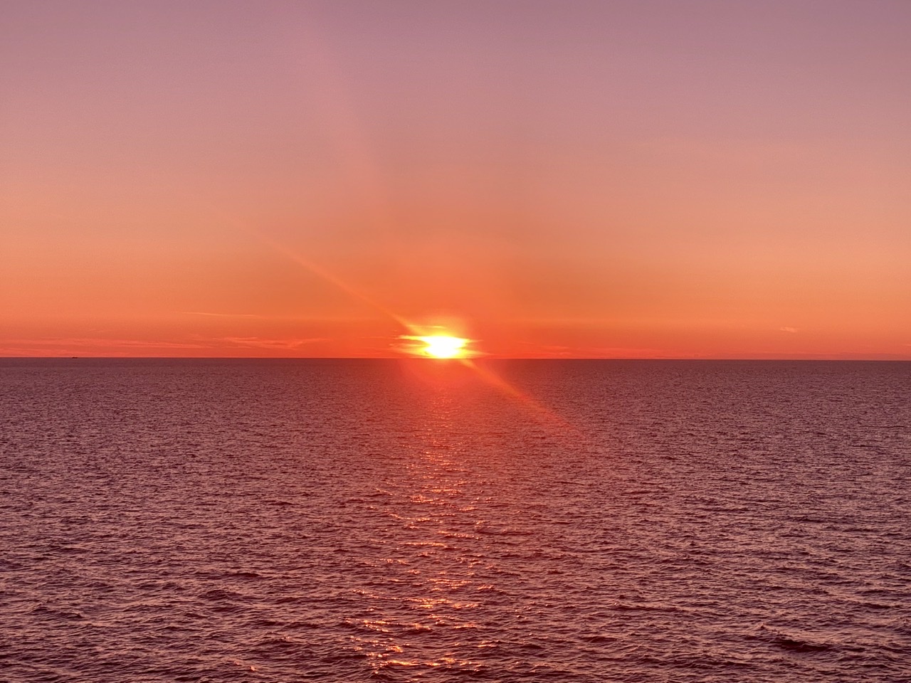 Nach einem schönen Sonnenuntergang saßen wir zunächst an den Tischen des (zu dieser Zeit geschlossenen) „Espresso House“, aßen unseren Proviant und bummelten ein wenig durch den Duty Free Shop. Später ruhten wir uns noch etwas in der Lounge mit Sesseln und Getränken aus, die den Passagieren zur Verfügung steht, die bis Fredrikshavn fahren und für die Zeit keine Kabine gebucht haben.