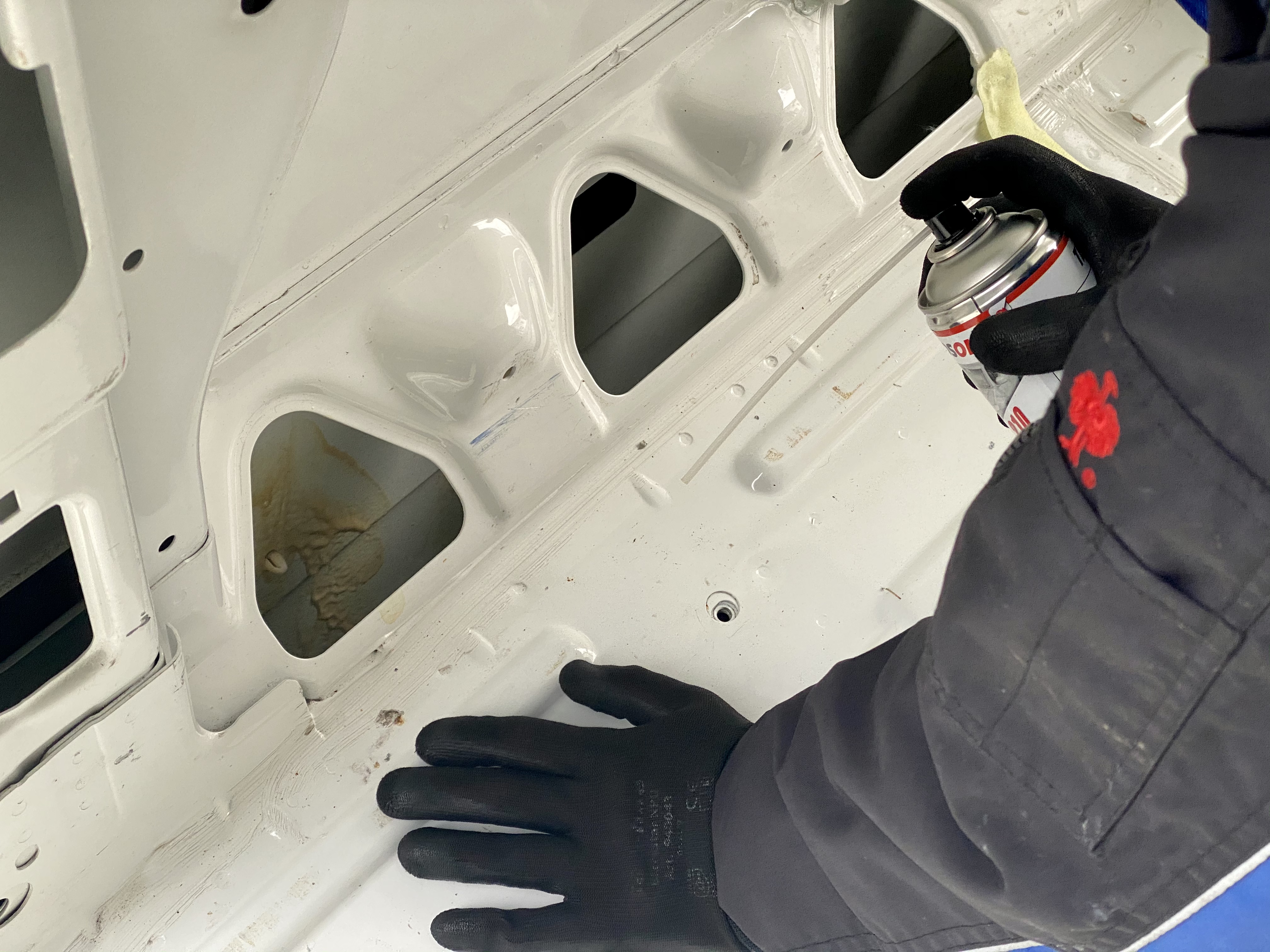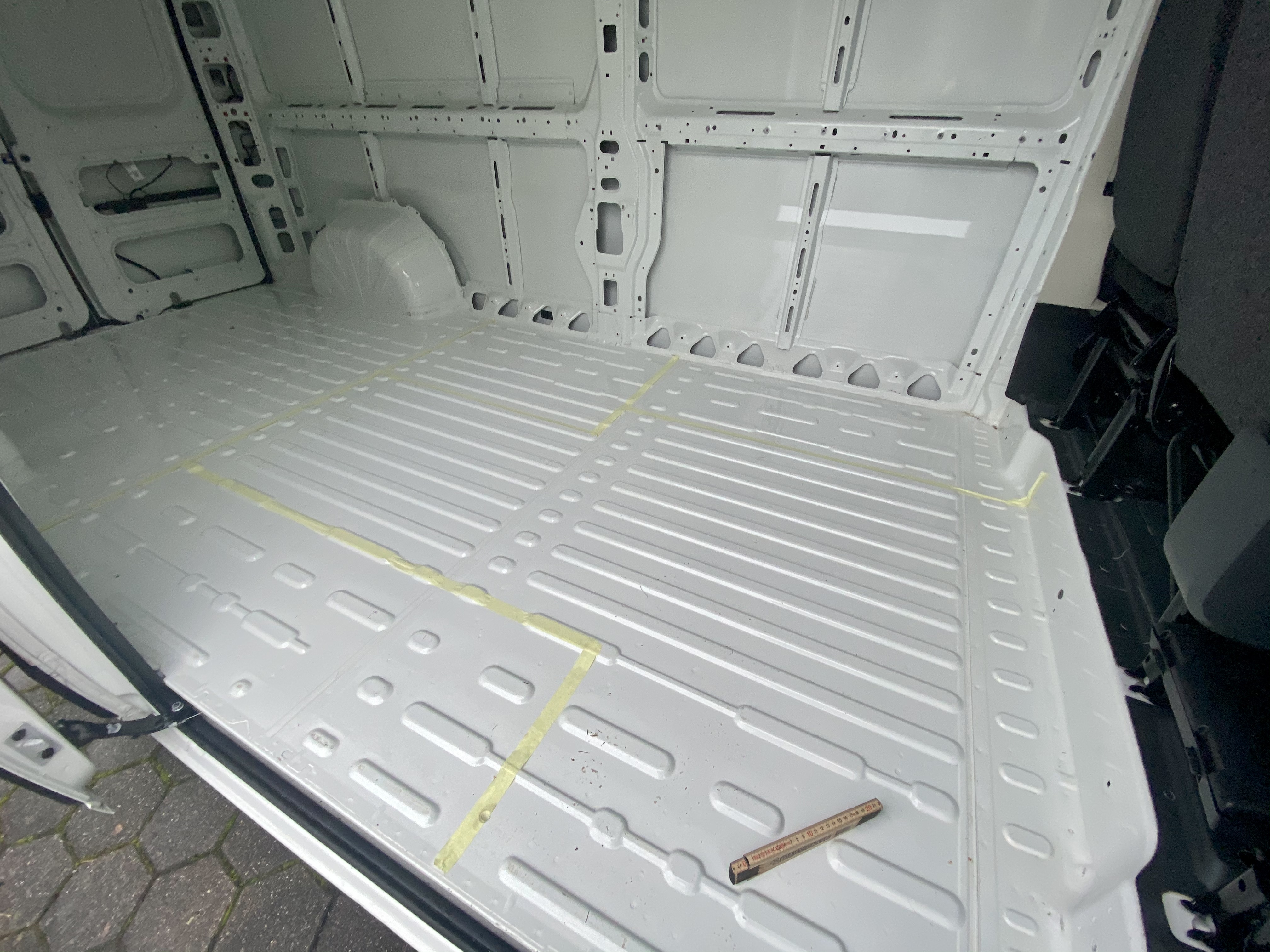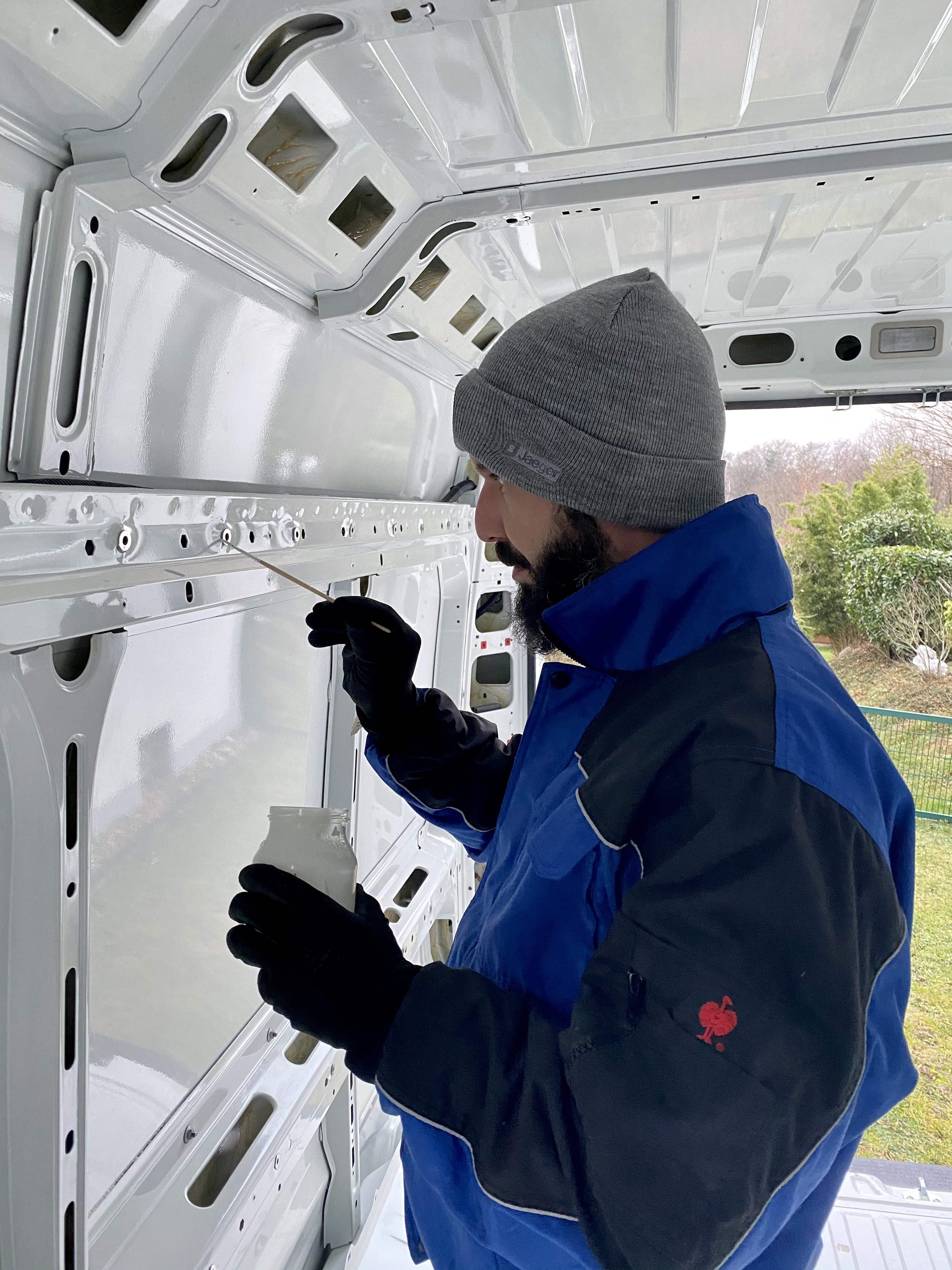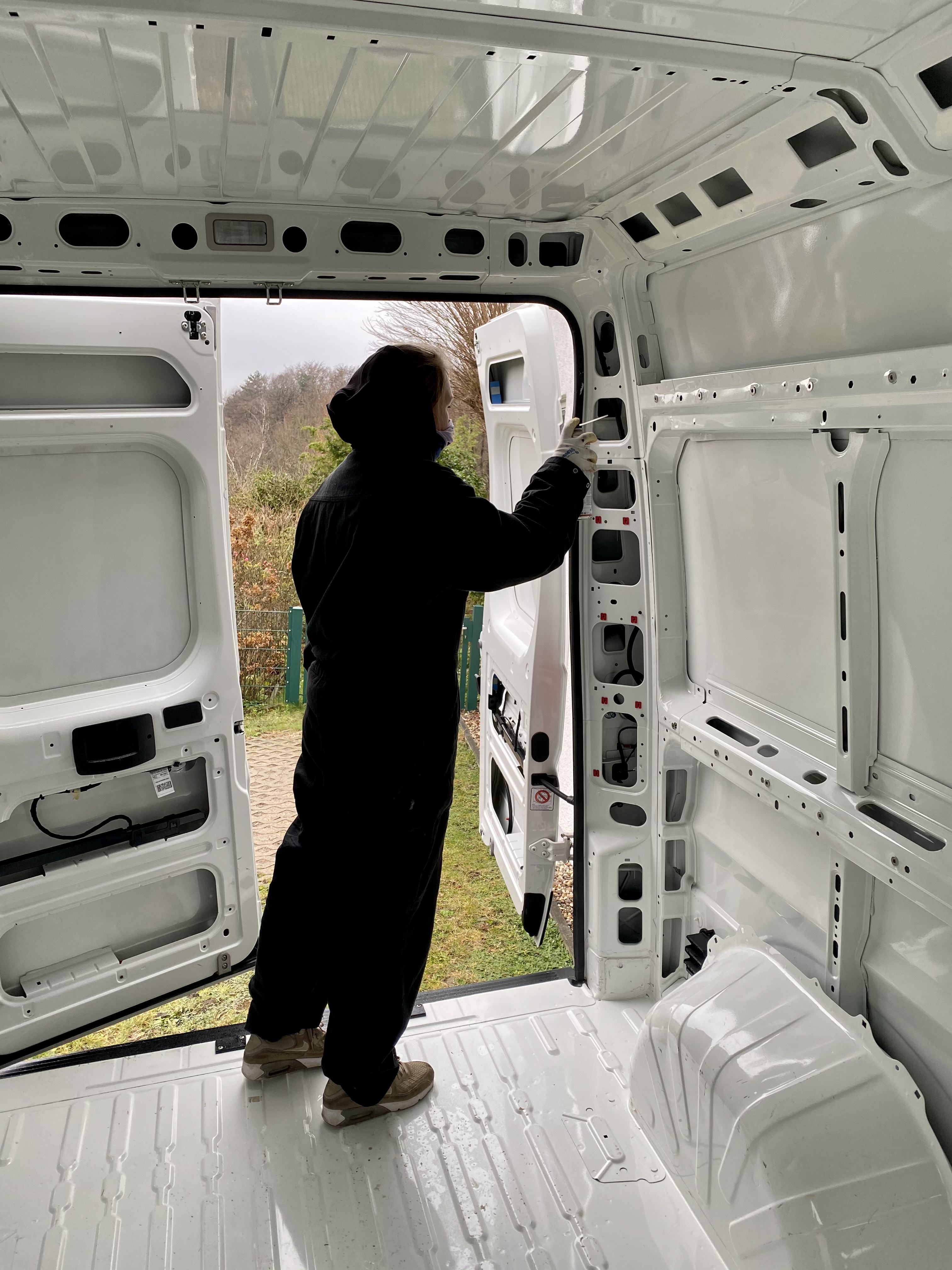 nochmals gemessen, auch auf dem Dach, das Layout und die Konstruktion des Dachträgers geplant. Als sichere Basis für unseren Jumper haben wir die Hohlräume versiegelt und (nach Reinigung mit Bremsenreiniger) alle Schraubenlöcher und kleinen Schrammen mit Rostschutz betupft bis es dunkel wurde.
