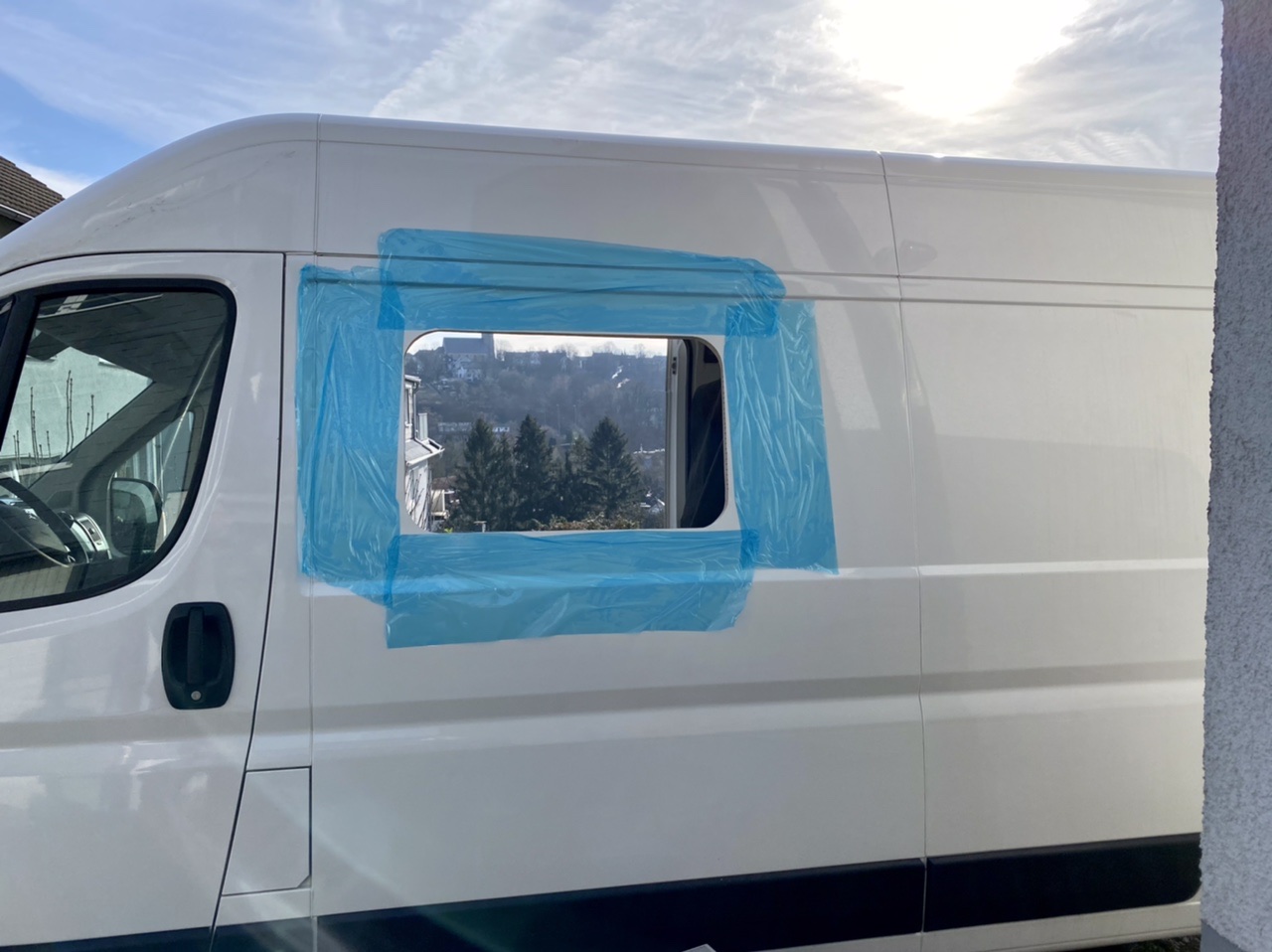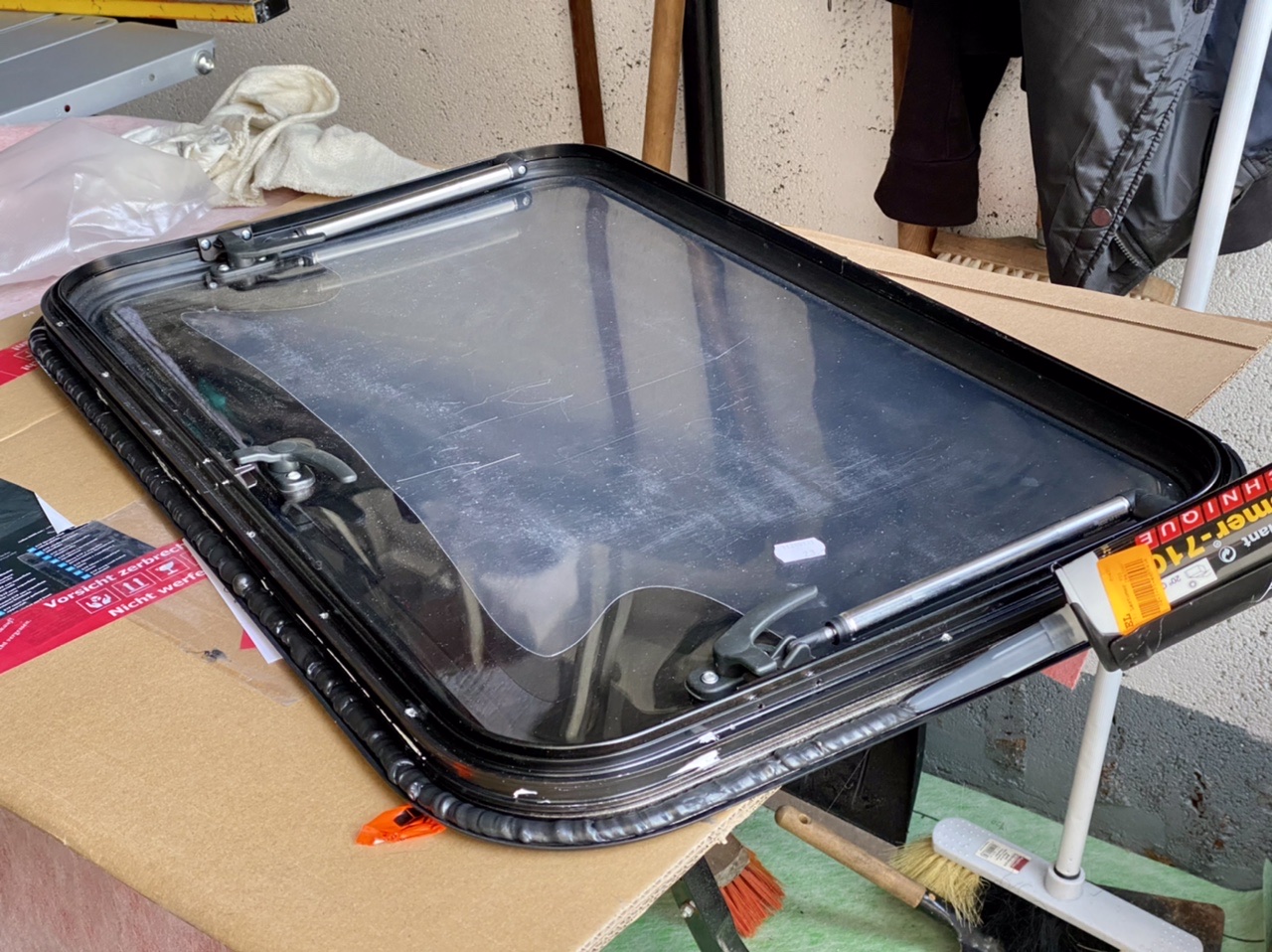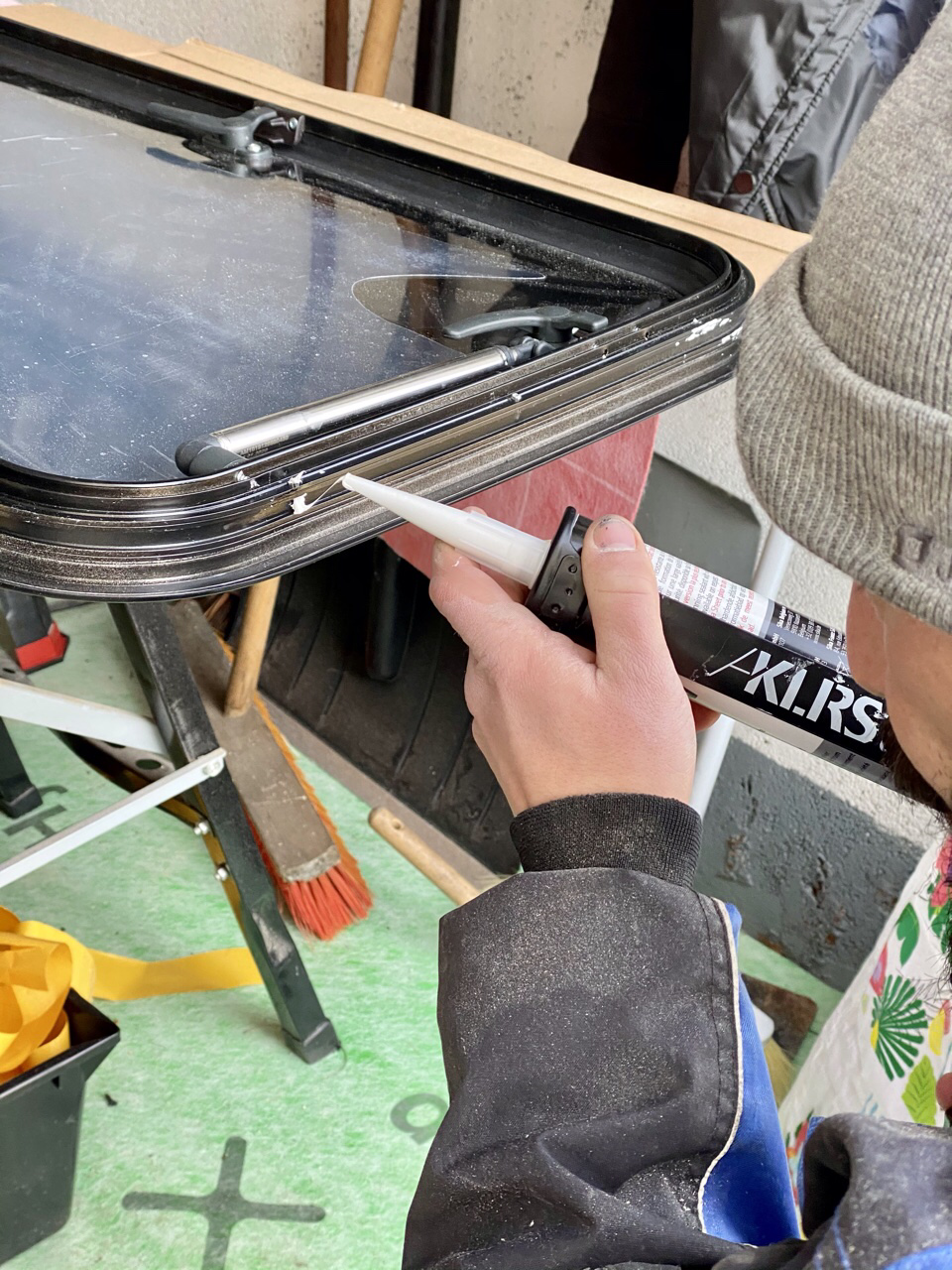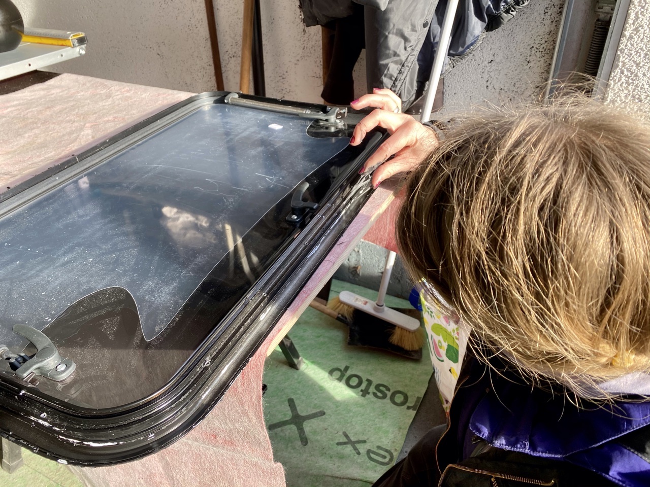 Zusätzlich mussten wir feststellen, dass eines unserer Seitenfenster offensichtlich undichte Stellen hatte. Also musste es am Sonntag wieder ausgebaut werden. Die zwei undichten Stellen im Fensterrahmen waren gut sichtbar, nachdem die komplette Dichtungsmasse entfernt war. Danach konnten wir sowohl die betroffenen Stellen als auch das Fenster erneut eindichten, in der Hoffnung, dass es nun dicht bleibt… Im Gegensatz zum Samstag hatten wir für diese Außenarbeiten sonntags wenigstens den ganzen Tag über strahlenden Sonnenschein.