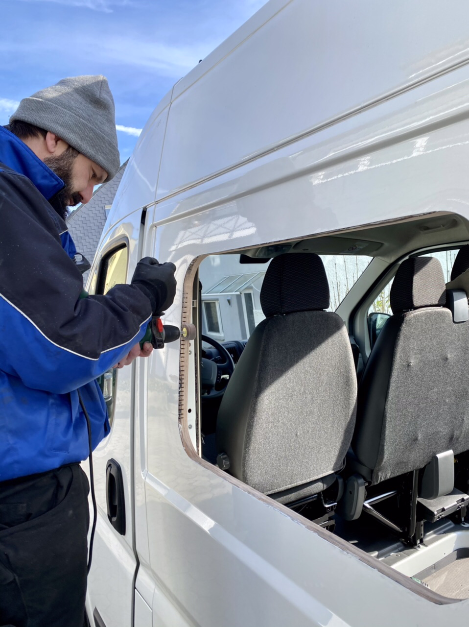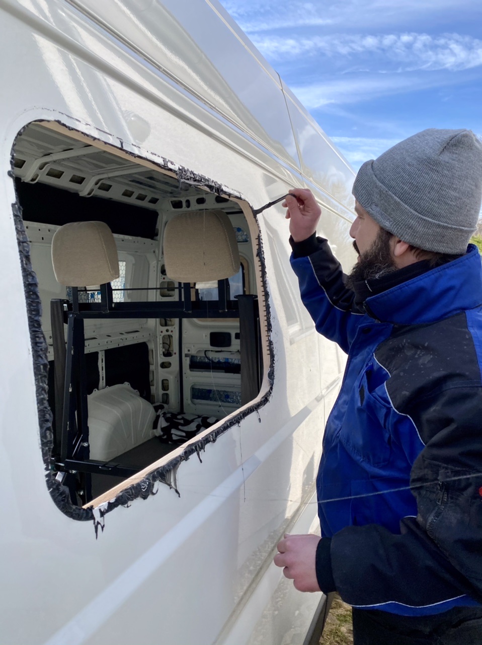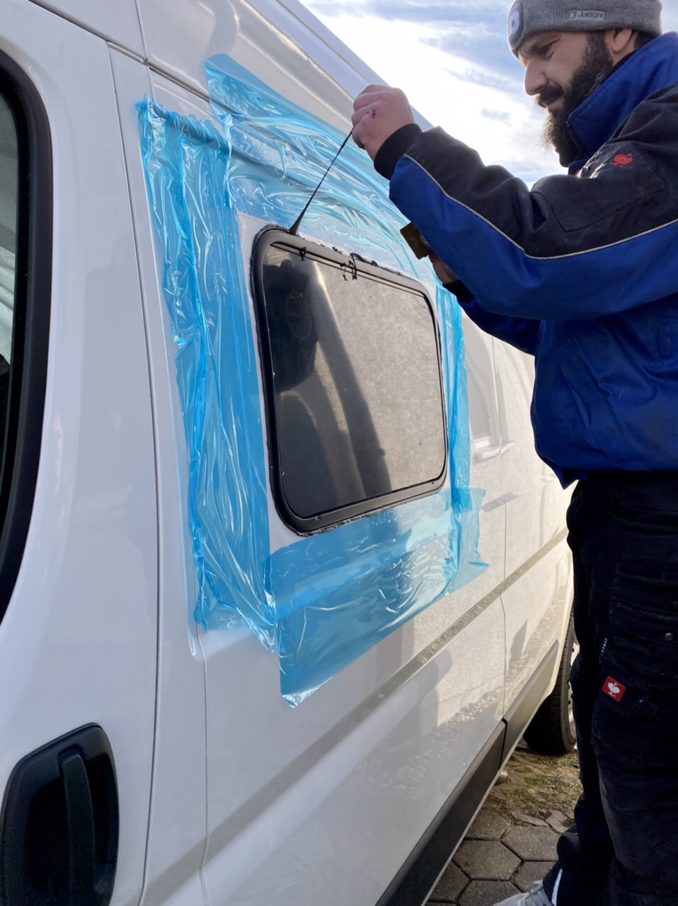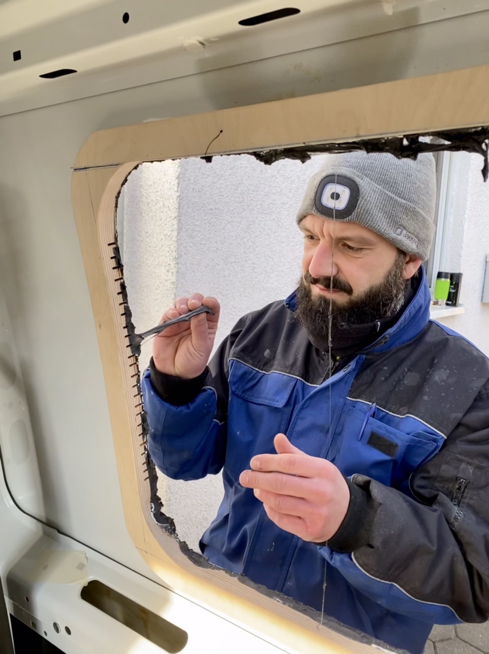 Zusätzlich mussten wir feststellen, dass eines unserer Seitenfenster offensichtlich undichte Stellen hatte. Also musste es am Sonntag wieder ausgebaut werden. Die zwei undichten Stellen im Fensterrahmen waren gut sichtbar, nachdem die komplette Dichtungsmasse entfernt war. Danach konnten wir sowohl die betroffenen Stellen als auch das Fenster erneut eindichten, in der Hoffnung, dass es nun dicht bleibt… Im Gegensatz zum Samstag hatten wir für diese Außenarbeiten sonntags wenigstens den ganzen Tag über strahlenden Sonnenschein.