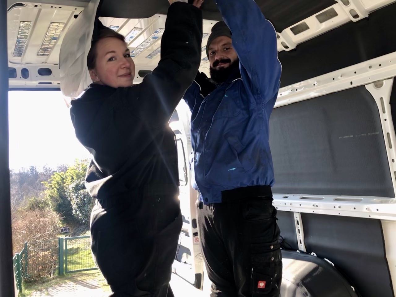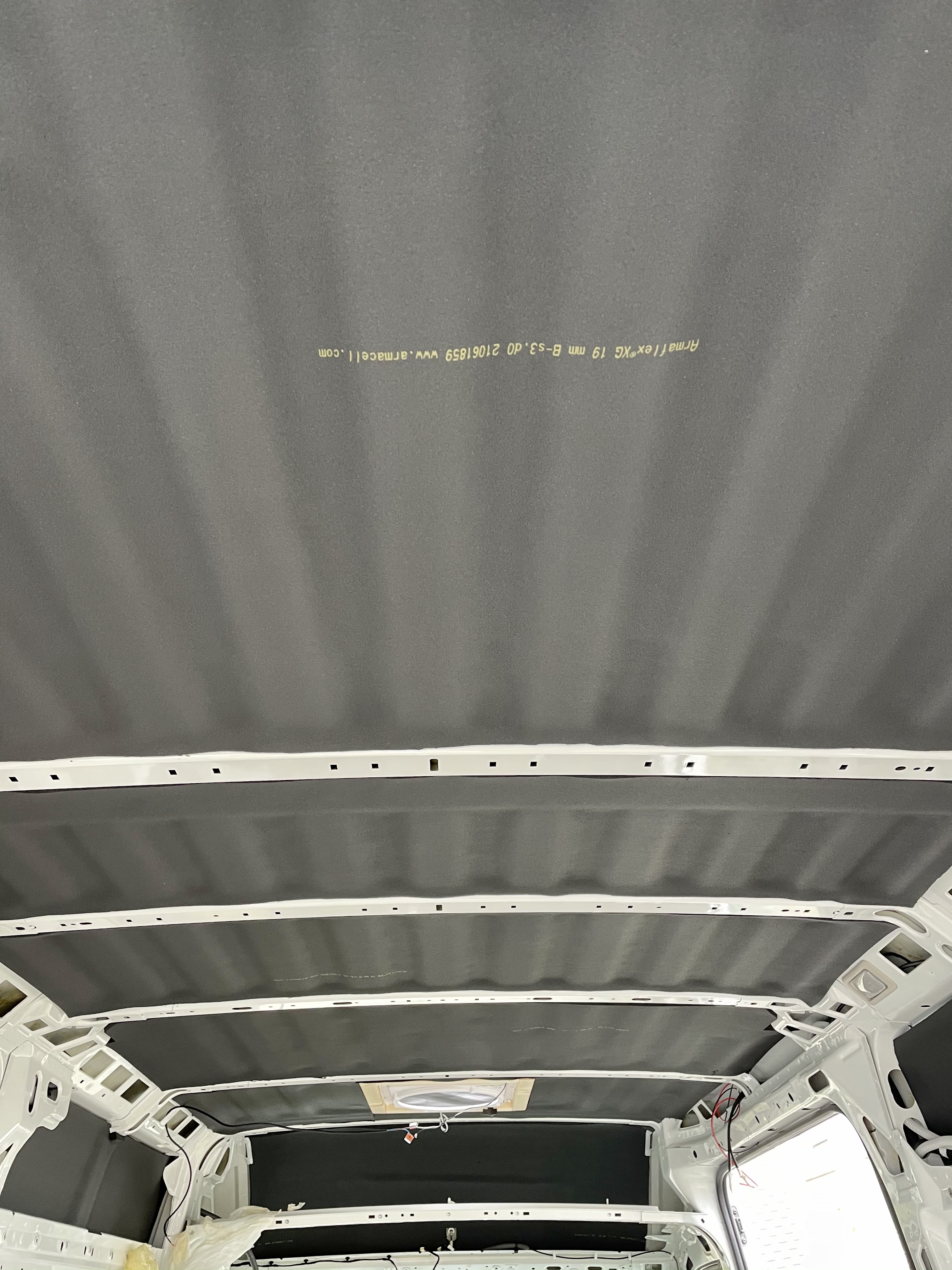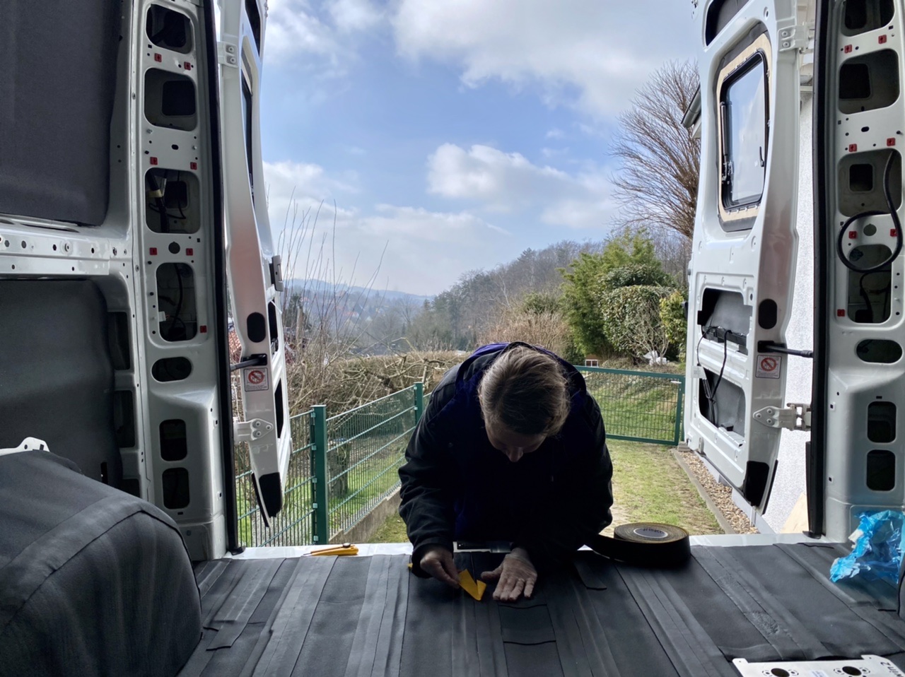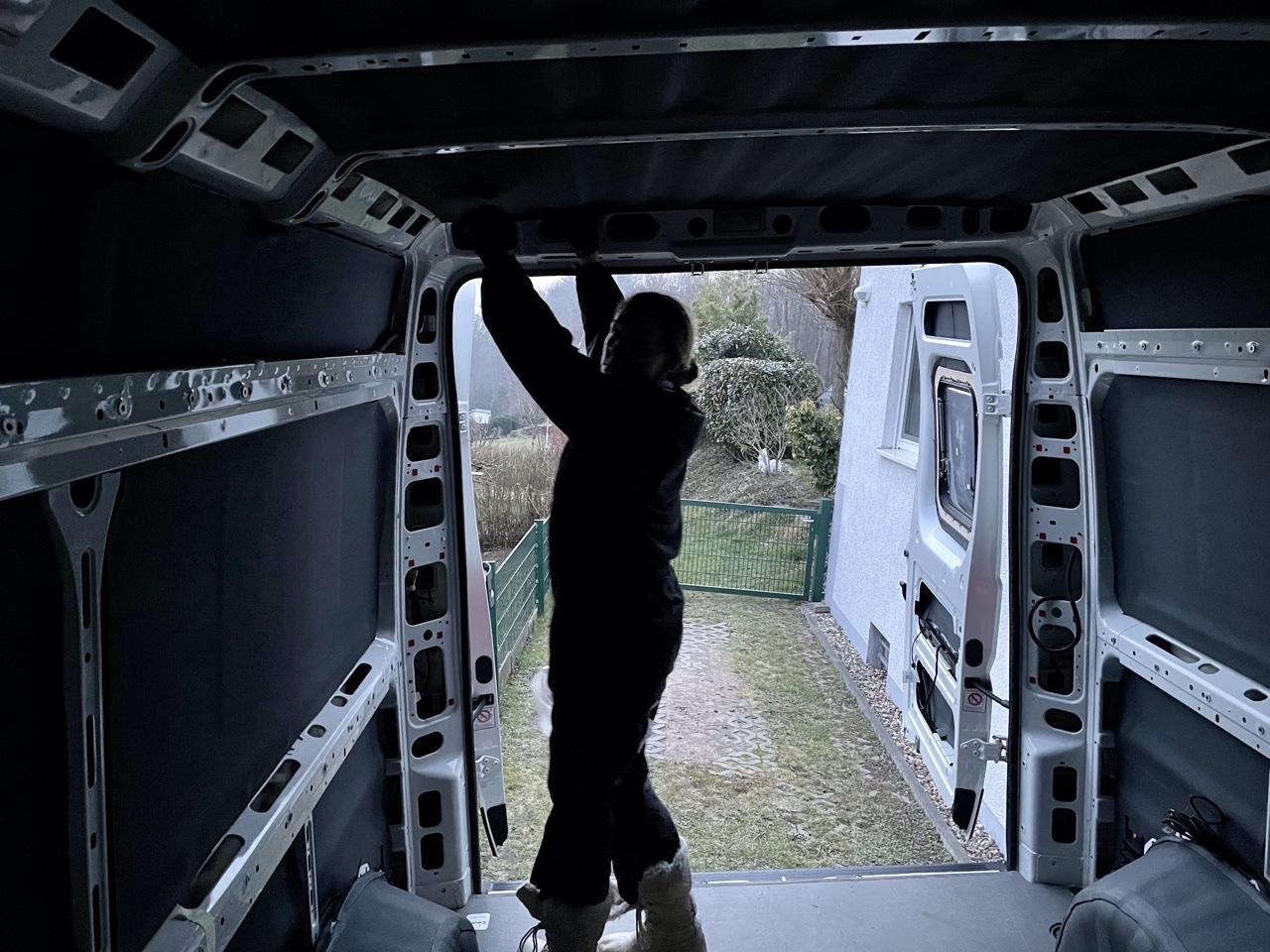 In den letzten Wochen konnten wir endlich ein paar „Meilensteine“ auf dem Selbstausbau – Weg erreichen, vor allem da Philipp momentan frei hat und mehr Zeit in den Van stecken kann. Neben diesen Meilensteinen ist die Dämmung mal wieder weiter voran geschritten. Diese wurde zunächst auf dem Boden vervollständigt und um die Radkästen herum. Dazu haben wir sowohl mit 19mm Armaflex als auch 3mm Tape gearbeitet. Die Decke haben wir hauptsächlich zusammen gedämmt. Zu guter letzt ist nun auch das Dach über der Ablage im Fahrerbereich mit Armaflex beklebt worden, in ähnlicher Puzzle-Arbeit wie bereits in den Türen. So können wir uns dort bald ein Fach für Stauraum schaffen. Einen Tag hat Philipp mit freundschaftlicher Unterstüzung außerdem dafür nutzen können, die Stromkabel schon mal durch den Van bzw. die Holme zu ziehen.