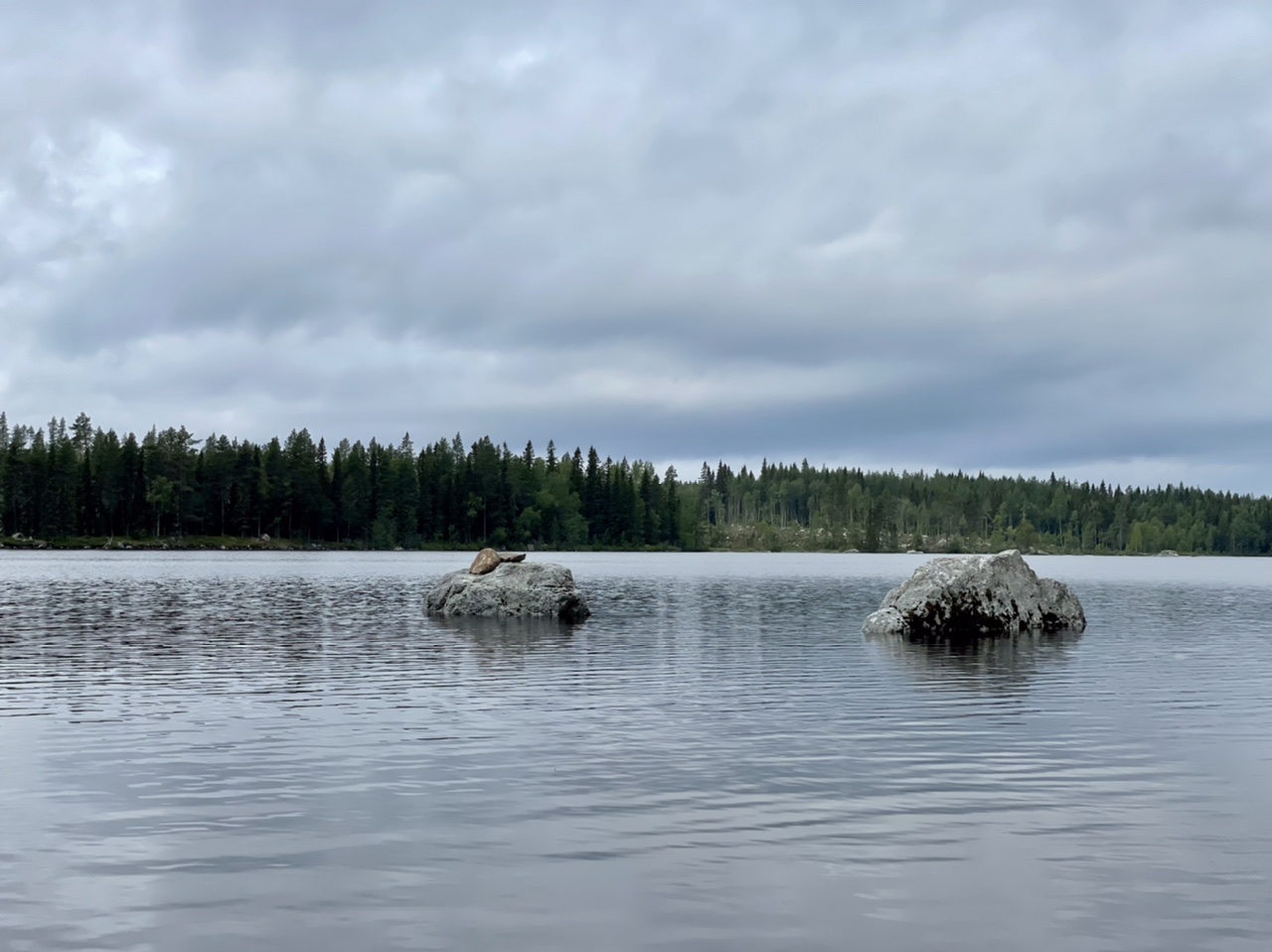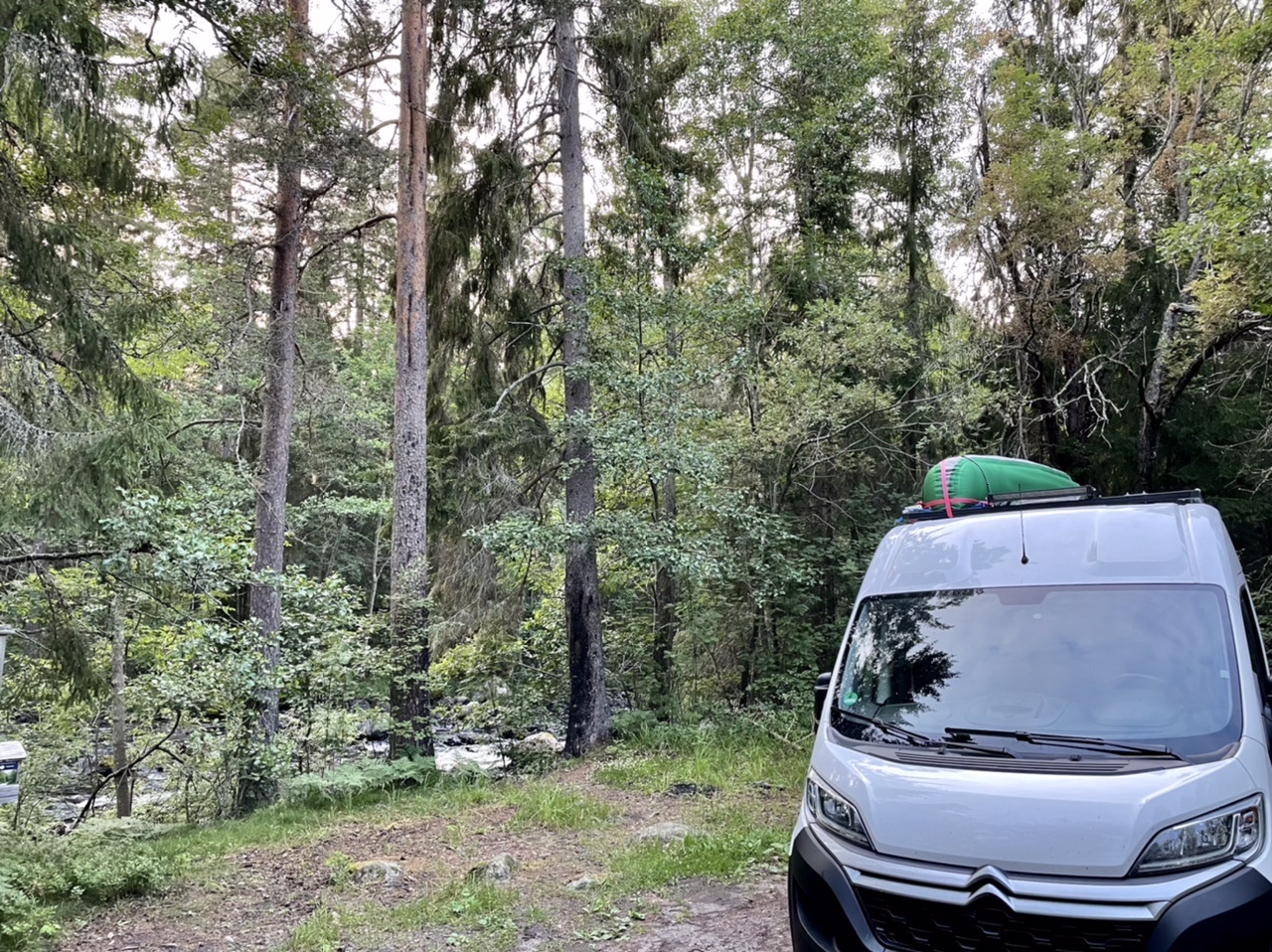 Nach dem Aufstehen nutzten wir heute zuerst das trockene Wetter aus um eine kleine Kajak-Runde auf dem See zu paddeln. Anschließend wurde das Boot wieder auf dem Van-Dach verstaut und mit einsetzenden Regen (erstmals seit wir in Schweden sind) machten wir uns auf den weiteren Weg. Es ging mit zunehmend sonnigem Wetter nicht nur durch Wälder und an Seen vorbei, sondern auch durch kleine Örtchen. In einem davon deckten wir uns mit Frühstück, Kanelbullar und Kaffee ein, nur im kurz danach eine gefühlte Ewigkeit kein anderes Fahrzeug mehr auf unserer Route zu sehen. Nachmittags machten wir noch kurz in Sundvall Halt und suchten uns zum Abend einen einsamen Platz im Wald am Testeboån-Fluss. Nach einer kleinen Runde durch das Naturschutzgebiet wurde wieder gegrillt und geschlafen als es fast dunkel wurde.