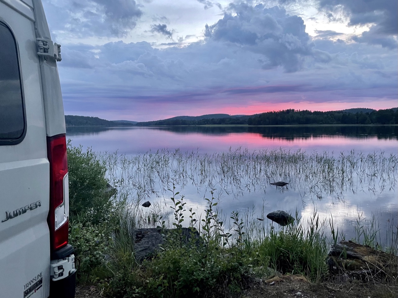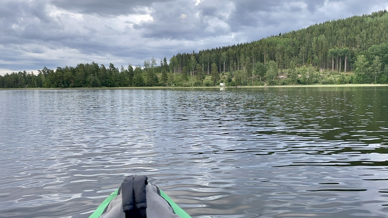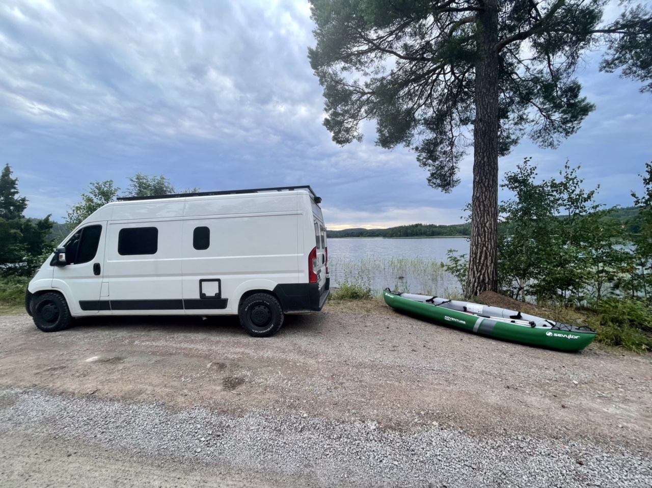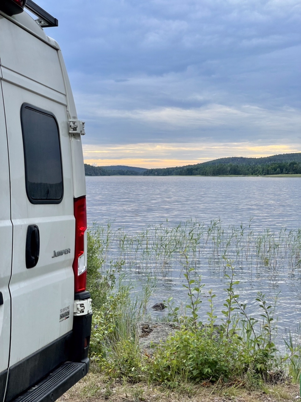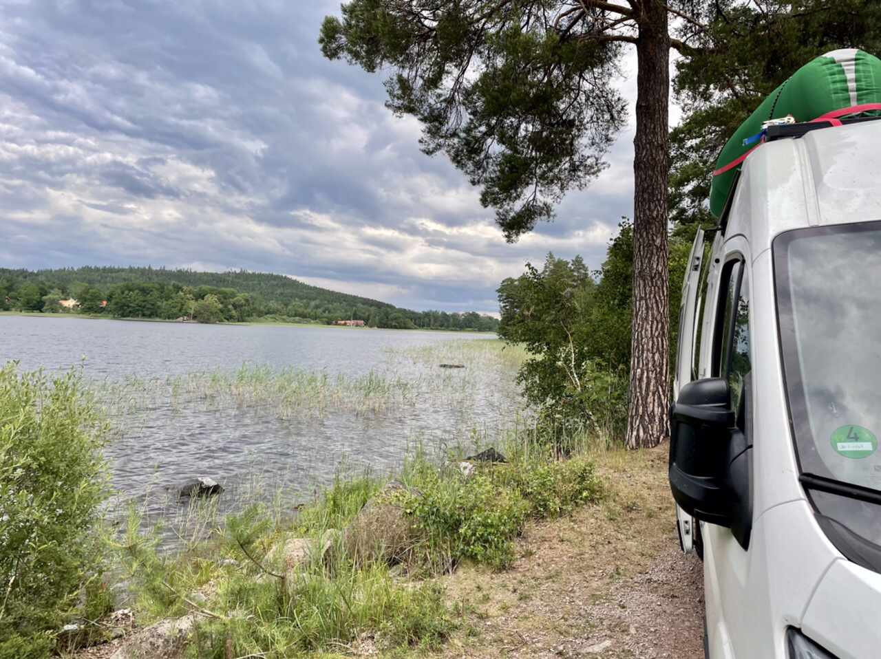 Nach einer kurzen Nacht starteten wir unseren Tag mit Espresso und Yoga, bevor wir zusammen packten und an der Cirkle K in Gävle Kaffee & Brötchen holten. Dann fuhren wir zu „Naturkompaniet“ um uns nach einigen Tagen Bedenkzeit doch endlich die gewünschte Axt zu kaufen (handgemacht in Schweden). Anschließend ging es nach einem kurzen Stop an der Entsorgungsstation auf eine lange Fahrt bei Sonne und 30 Grad über Landstraße und Autobahn. Nachmittags machten wir einen kleinen Bummel durch das Freilichtmuseum Gamla Linköping und waren einkaufen. Am Abend fanden wir schließlich einen Stellplatz direkt am Nedre Fölingen mit Blick auf den See im Sonnenuntergang. Es ging noch auf eine letzte Kajak-Runde in Schweden und kurz ins angenehm  warme Wasser. Für die anstehende Heimreise wurde das Boot von uns wieder zusammen gefaltet und in der Heckgarage verstaut. In der untergehenden Sonne konnten wir noch lange gemütlich sitzen und grillen, bevor es spät und müde, aber im Dunkeln ins Bett im LokiVan ging.