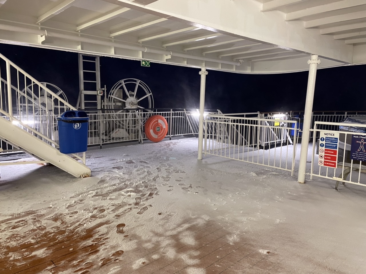 Nachdem wir kurz vor Weihnachten noch unsere Akkus mit einer kompletten zweiten Kiste verdoppelt haben, machten wir den LokiVan möglichst winterfest. Vorsichtshalber mit Schneeketten und Sandbrettern als Anfahrhilfe ausgestattet, ging es für uns direkt nach Weihnachten los. Wir machten uns auf die Reise durch Dänemark (ohne Kontrolle der geforderten Covid-Tests) bis zur Fähre in Fredrikshavn (wo man nun aber unsere Pässe und Impfzertifikate überprüfte). Nach langer Wartezeit am Hafen und einem kurzen Rundgang auf und unter Deck, verbrachten wir eine kurze, etwas schaukelnde Nacht auf der Fähre.