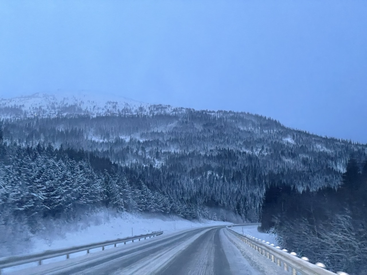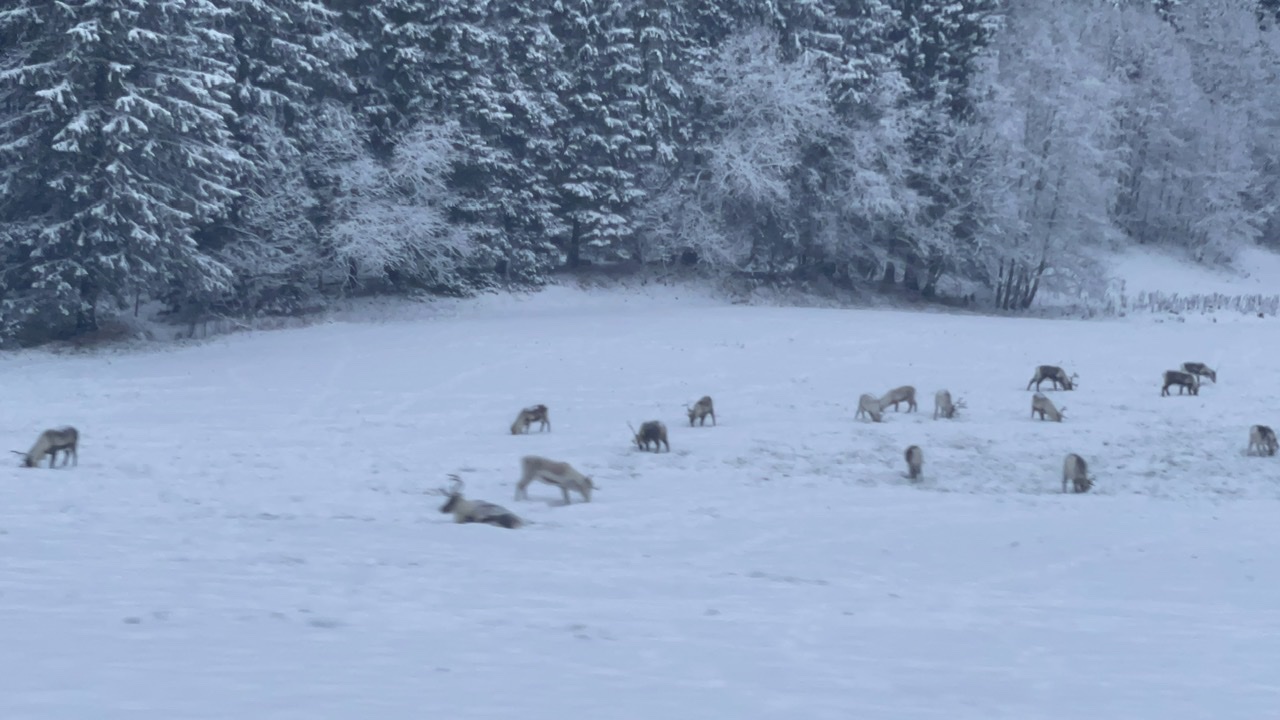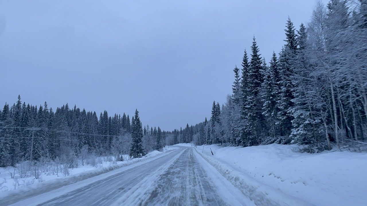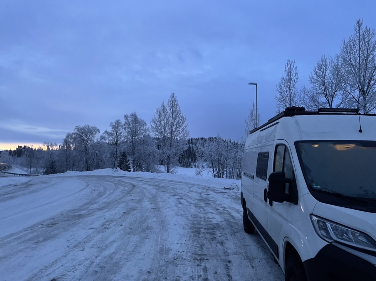 Nach einer kurzen und kuscheligen Nacht im LokiVan haben wir leider feststellen müssen, dass unsere Wasserleitungen eingefroren waren. Also fiel das Frühstück recht kurz aus und wir suchten uns zunächst eine Tankstelle und Einkaufsmöglichkeiten. Diese fanden wir nach einer Fahrt vorbei an kleinen Rentier-Herden, Wäldern, Flüssen und Bergen bedeckt mit Eis (Zapfen & Schollen) und hohem Schnee in Mosjøen / Nyrud. Mit einem dort erworbenen Reisefön tauten wir auf dem Parkplatz die Wasserleitungen auf. Bei der Weiterfahrt fing es schon an, dunkel zu werden. Wir fuhren vorbei am völlig zugeschneiten Arctic Circle Center am Polarkreis, an einigen Elchen (zum Glück in einiger Entfernung von der Fahrbahn) bis zum Parkplatz Bonå Parking zwischen Aspfjord und Sørfjord. Dort wurde nochmals an der Sicherung und der Verkabelung des Zigarettenanzünders gebastelt, bevor es wieder spät ins warme Bett ging.