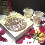 Einen Weißwein, einige Wasser, ein tolles Emirates-Menü, einen Kaffee und einen Cognac später bekommen wir noch diese tolle Überraschung serviert (Honeymoon-Cake mit Champagner).